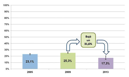 El consumo de tabaco bajó significativamente: del 29,7 por ciento de la población en 2005 al 27,1 en 2009 y el 25,1 en 2013. La exposición al humo de tabaco ajeno en bares o restaurantes bajó del 47,2 al 23,5 por ciento; en el trabajo, del 34 por ciento al 25 por ciento; en el hogar, también bajó, pero no tanto: del 33,9 en 2009 al 27,6 por ciento en 2013.